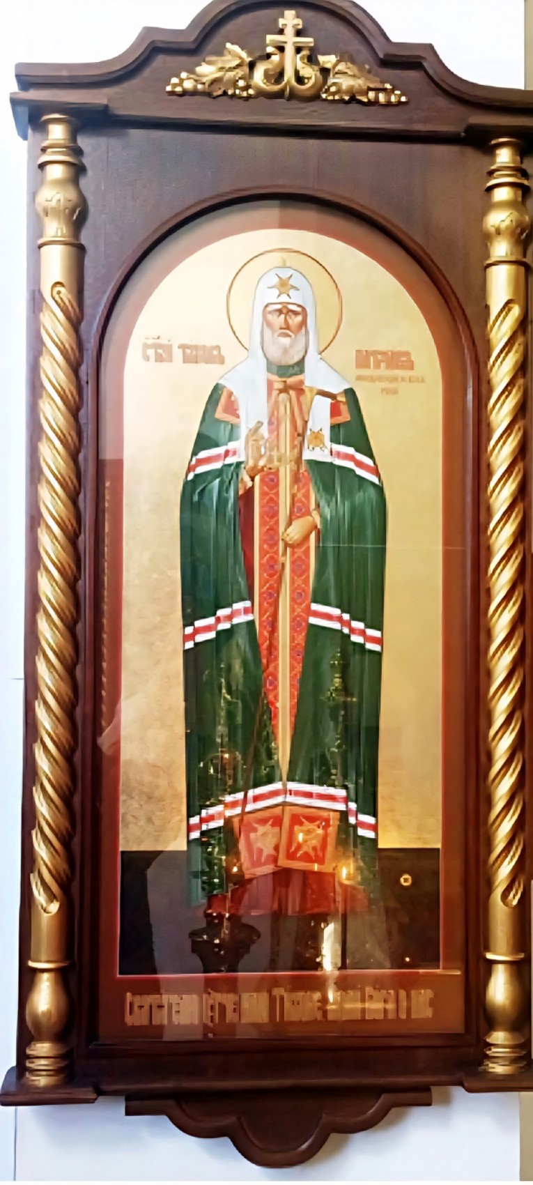 Святитель Тихон (Беллавин), патриарх Московский и всея России . На сегодняшний день частица мощей вставлена в икону 60х135 см.