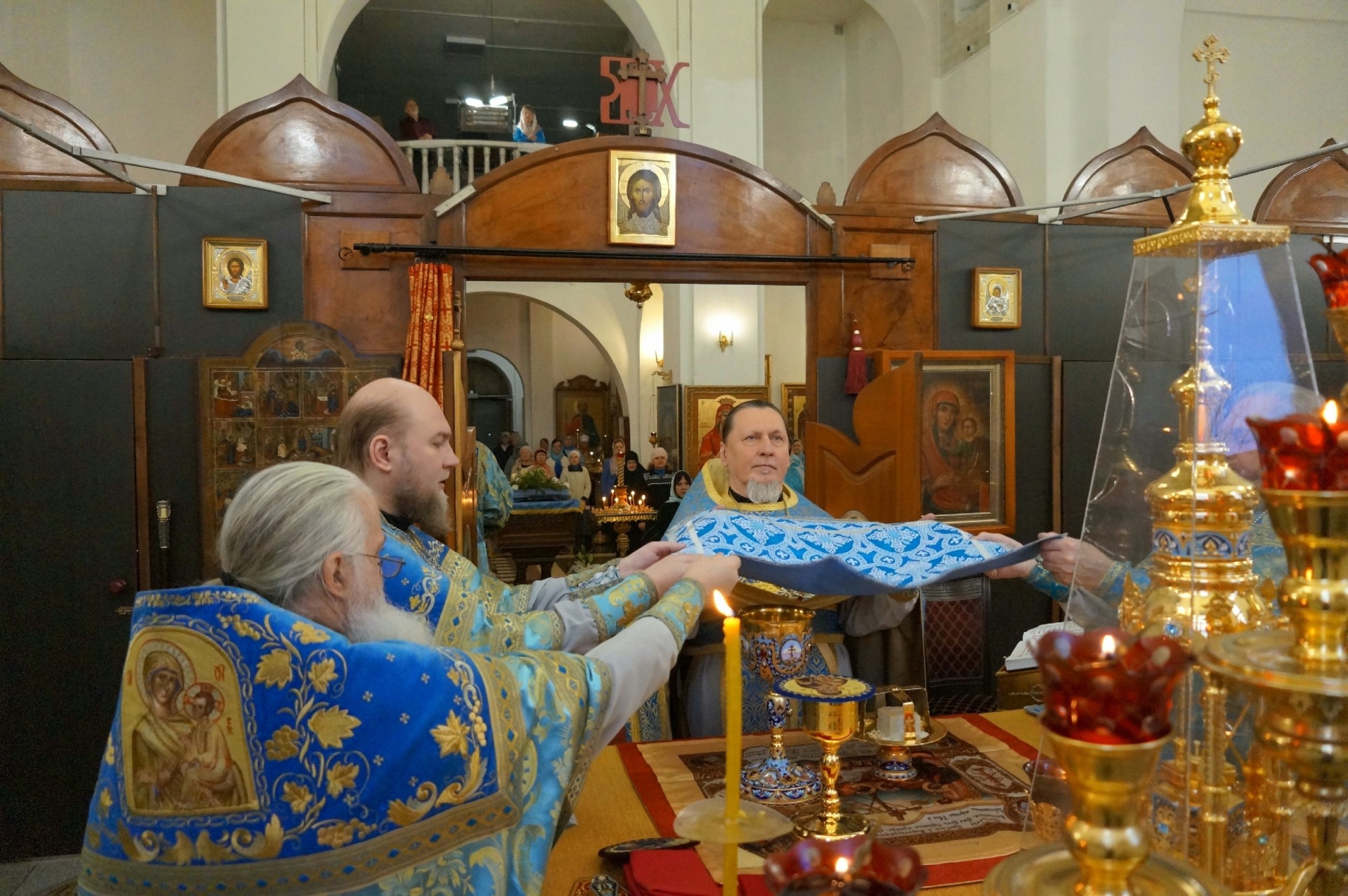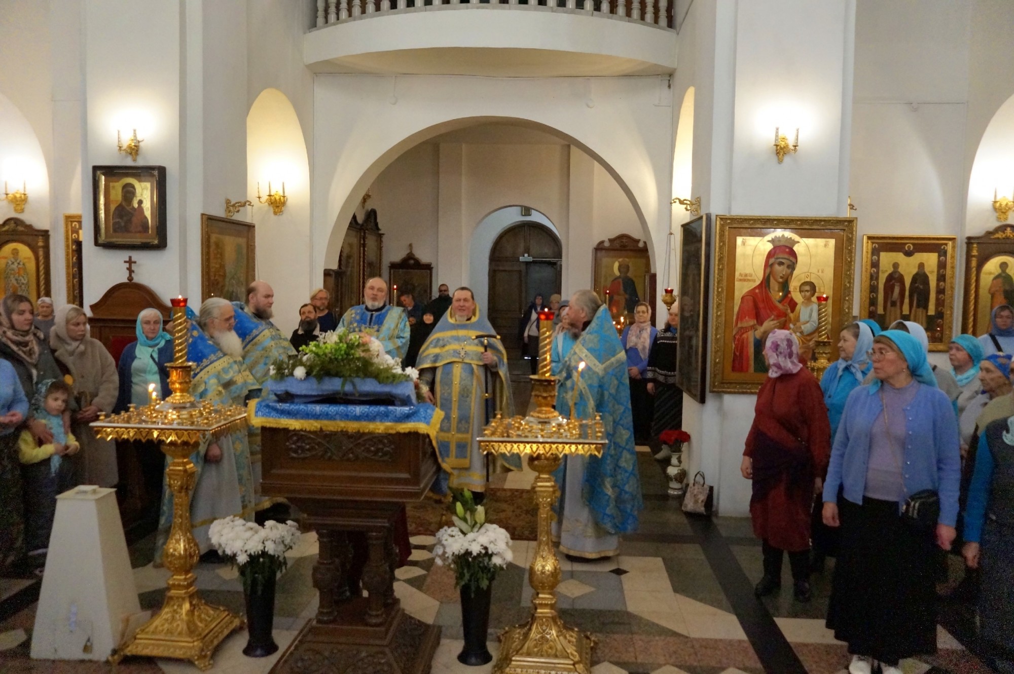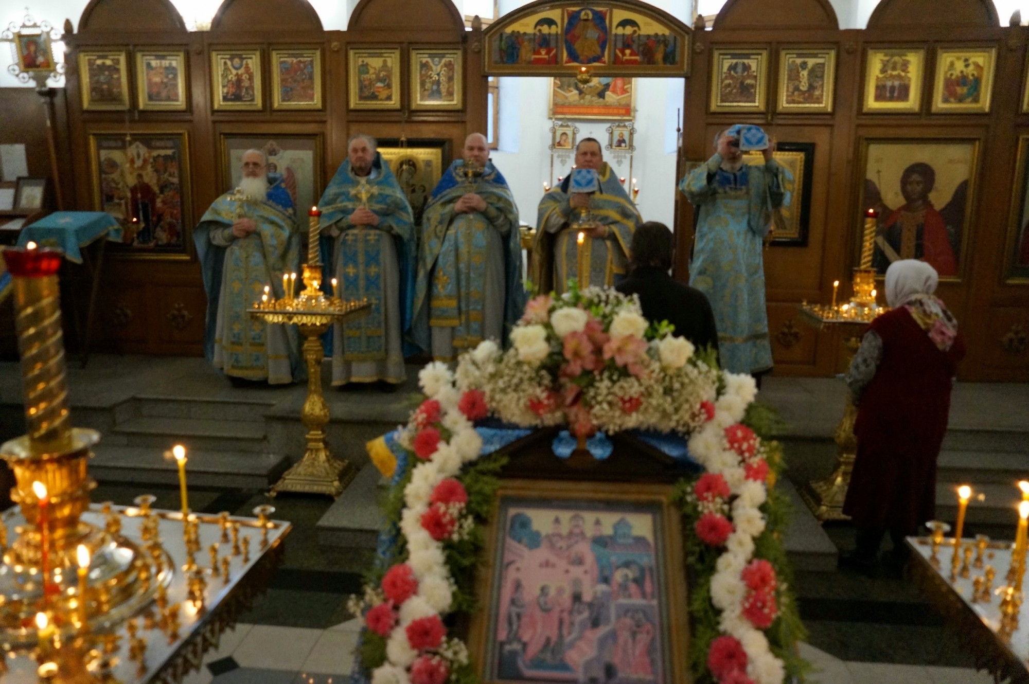 В конце Богослужения игумен Нестор с духовенством совершили славление Божией Матери. Было пропето кондак , тропарь и величание Пресвятой Владычице нашей Богородице и Приснодеве Марии.