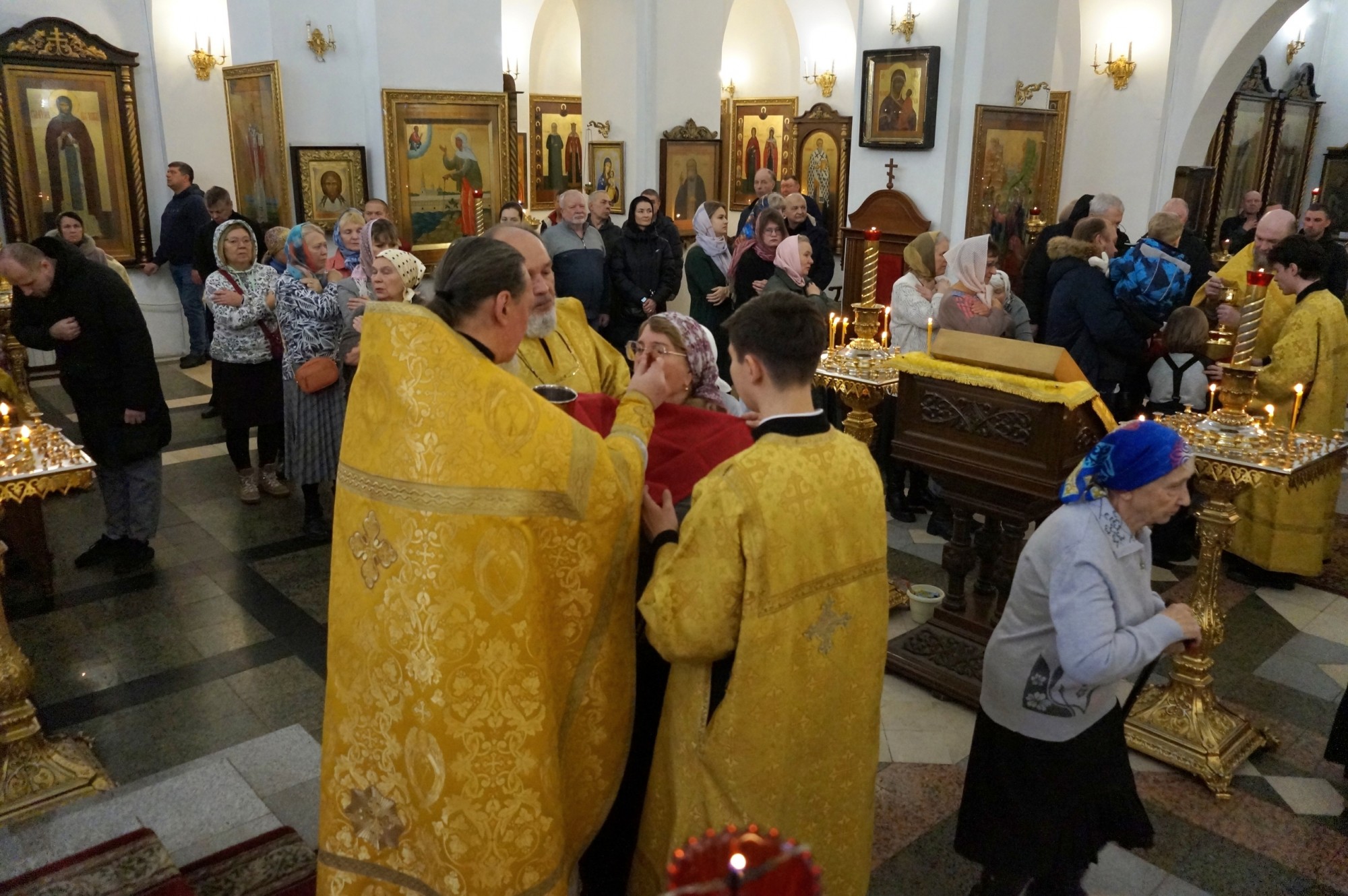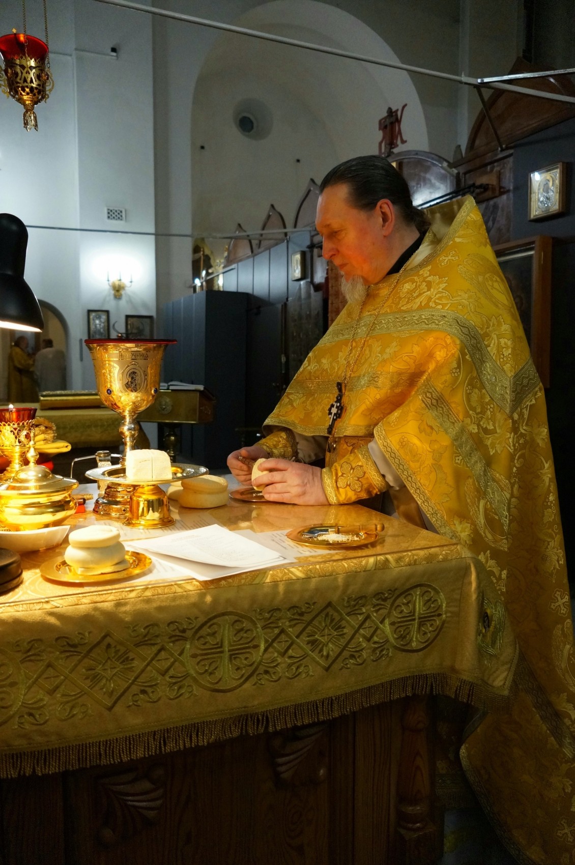 иеромонах Иоанн(Решетов), иеромонах Феодор (Шабакин). Диаконский чин:иеродиакон Петр(Томин ). На сугубой ектении были произнесены особые прошения «… о еже прияти молитвы нас недостойных рабов Твоих в сию годину испытания, пришедшую на Русь Святую…». Затем была вознесена молитва о Святой Руси. По благословению Святейшего Патриарха Московского и всея Руси Кирилла эта молитва возносится во всех храмах Русской Православной Церкви. Игумен Нестор в проповеди сказал, что сегодня мы с вами прослушали евангельский отрывок – притчу о званых на вечерю. Некий царь сделал брачный пир для своего сына и послал слуг своих, чтобы они пригласили званых на пир. И вот на это торжество царь звал многих. Царь – это Бог. И званые начали отказываться. Один за другим они находили уважительные, по их мнению, причины, которые не позволяли им пойти на этот брачный пир. Первый говорит, что я купил землю и мне нужно пойти посмотреть ее. Прошу тебя, извини меня. В славянском переводе это звучит так: имей мя отреченна, то есть, попросту, – отстань от меня, не приставай. Поскольку притча – повествование иносказательное, под землей здесь понимается собственность. Второй говорит, что купил пять волов и идет испытать их. Волы в то время – это сила, с помощью которой возделывалась земля. Потом это бы назвали трактором или комбайном. Под волами понимается труд, деятельность, общественная активность. Третий говорит: «Я женился и не могу прийти». И даже не извиняется. Здесь понятно ,что речь идет о семье. Ни первый, ни второй, ни третий не грешат. Собственность – не грех, труд – не грех, семья – не грех. Более того, все это людям Самим Богом дано и заповедано: Господь дал людям землю, велел трудиться, благословил брак. То, что все, полученное человеком от Бога, становится между Богом и человеком, разделяет их. У человека много собственности, кипучей деятельности, у него семья, заботы о которой также наполняют его жизнь, ведь столько всего надо успеть, чтобы и у детей все было не хуже, чем у других, так что для Бога уже не остается места. И все полученные от Бога дары становятся причиной к Богу не идти. Так было и во времена земной жизни Христа, и в наше время. Нередко можно услышать от очень хороших, добрых, нравственных людей, как они из-за собственности, труда и семьи не могут найти время для Бога. Да и не только время не могут найти – Он им неинтересен! Результат – гнев Божий. Когда мы Божии дары используем, о Подателе же благ забываем, то становимся чадами гнева Божия и то, что было даром Божьим, начинает разрушать нашу жизнь. Дальше Господь зовет уже не богатых, но нищих, хромых, убогих. Кто это такие? Те, у кого что-то не сложилось: с собственностью, работой семьей. Мы не знаем, по каким причинам это произошло.
