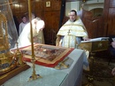На Литургии была прочитано Евангелие от Матфея (Мф.28:1-20): По прошествии же субботы, на рассвете первого дня недели, пришла Мария Магдалина и другая Мария посмотреть гроб.И вот, сделалось великое землетрясение, ибо Ангел Господень, сошедший с небес, приступив, отвалил камень от двери гроба и сидел на нем; вид его был, как молния, и одежда его бела, как снег; и устрашившись его, стрегущие пришли в трепет и стали, как мертвые;