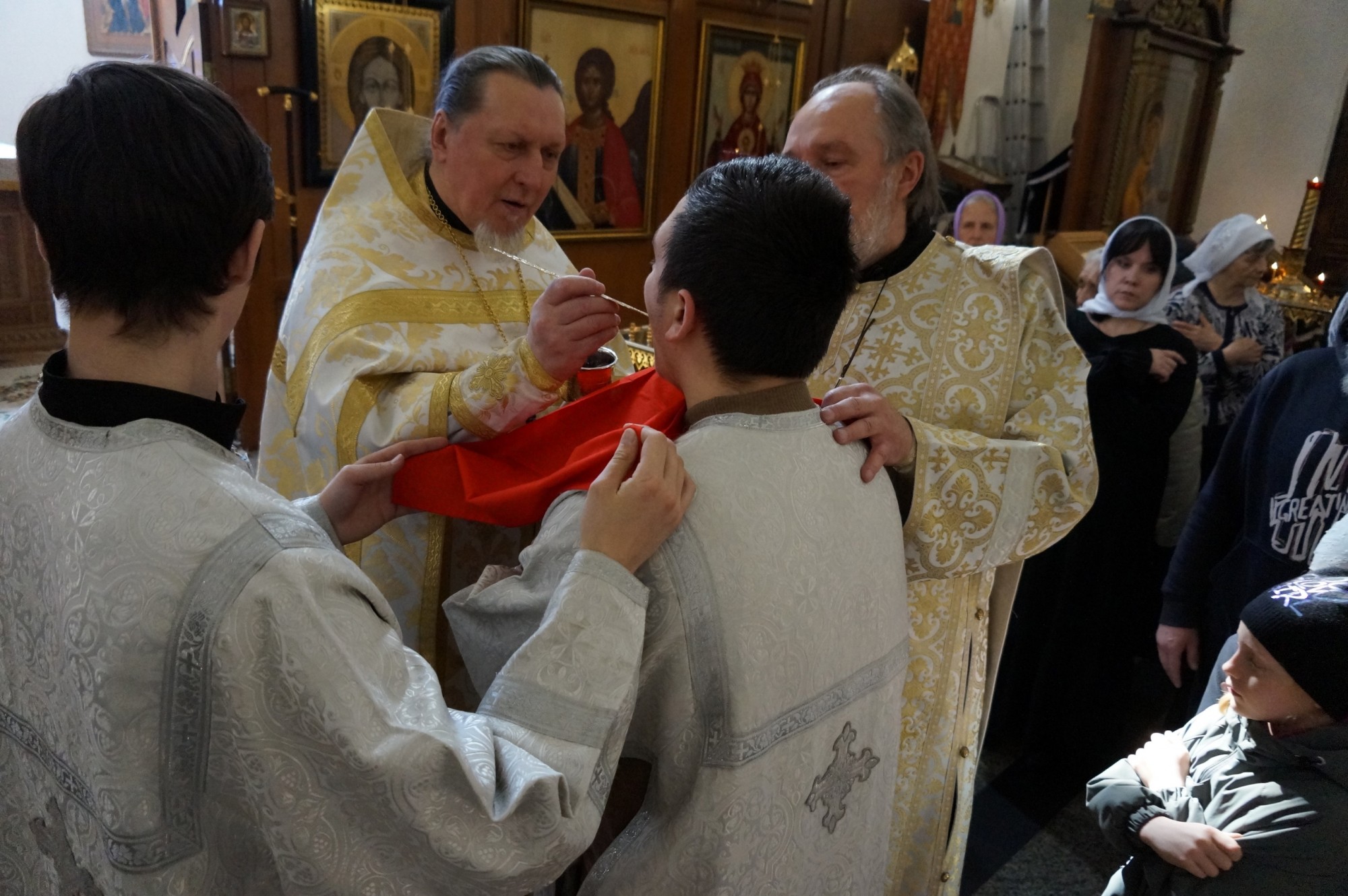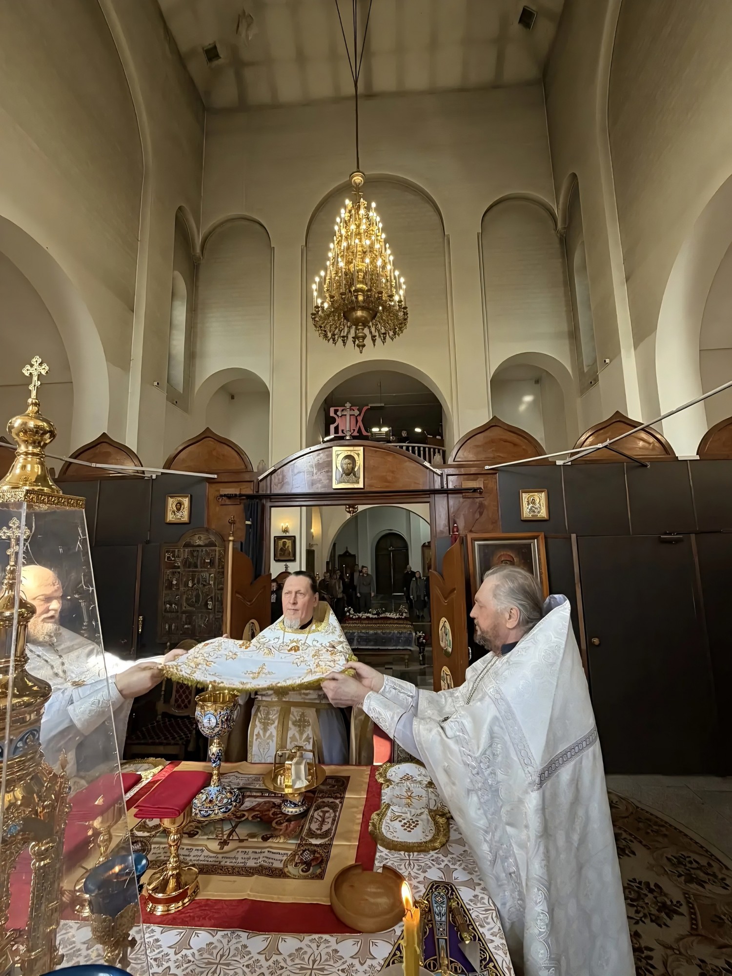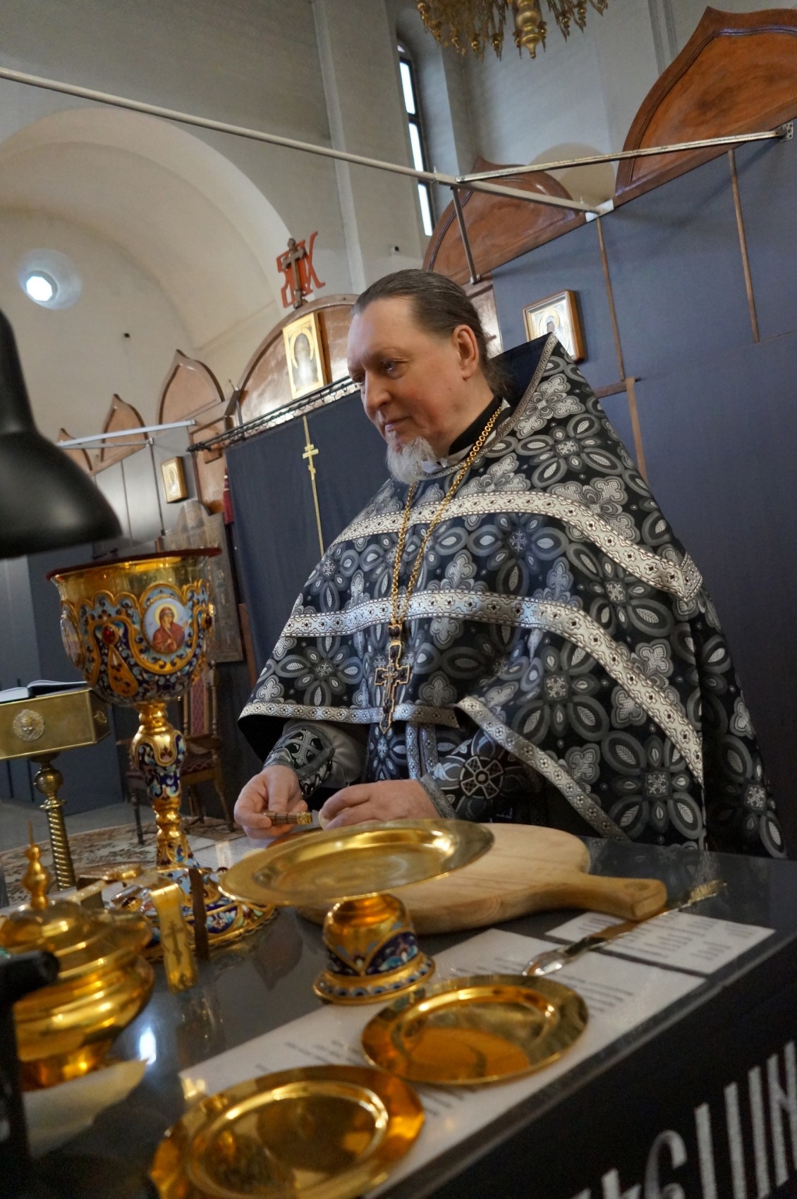 иеродиакон Петр (Томин ). По традиции, в конце богослужения Великой Субботы, были освящены хлеб и вино перед Святой Плащаницей .