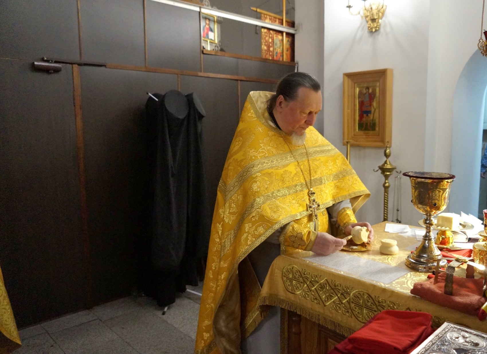 Диаконский чин:иеродиакон Петр (Томин ), иеродиакон Макарий (Кулаев). На сугубой ектении были произнесены особые прошения «… о еже прияти молитвы нас недостойных рабов Твоих в сию годину испытания, пришедшую на Русь Святую…». После сугубой ектении Игуменом Нестором была прочитана молитва о Святой Руси. За Воскресным Богослужением пел хор под управлением регента Екатерины Меньщиковой В проповеди Игумен Нестор поздравил всех с праздником, причастников – с принятием Святых Христовых Таин. В нынешнем Евангелии говорилось о двух чудесных благодеяниях, оказанных Спасителем нашим кровоточивой женщине и начальнику еврейской синагоги Иаиру. Первую Господь исцелил в один миг — через прикосновение ее к Его одежде; у другого воскресил из мертвых единородную двенадцатилетнюю дочь. В этом евангельском сказании поучительна для нас, во-первых, вера Иаира, начальника синагоги. У него при смерти единородная дочь, и он обращается с просьбой о помощи к Иисусу Христу, веруя, что Он одним словом может исцелить ее. Не бойся только, веруй, — сказал ему Господь, когда Иаиру донесли, что дочь его умерла, — и спасена будет. И он, по слову Господа, несомненно веровал, что дочь его будет воскрешена — и действительно увидел ее воскресшей. Так и мы, когда заболеваете или когда у вас заболевает жена или дети , обращайтесь прежде всего с молитвой о помощи к Иисусу Христу. Далее, в этой евангельской истории поучительна вера женщины, страдавшей двенадцать лет кровотечением.